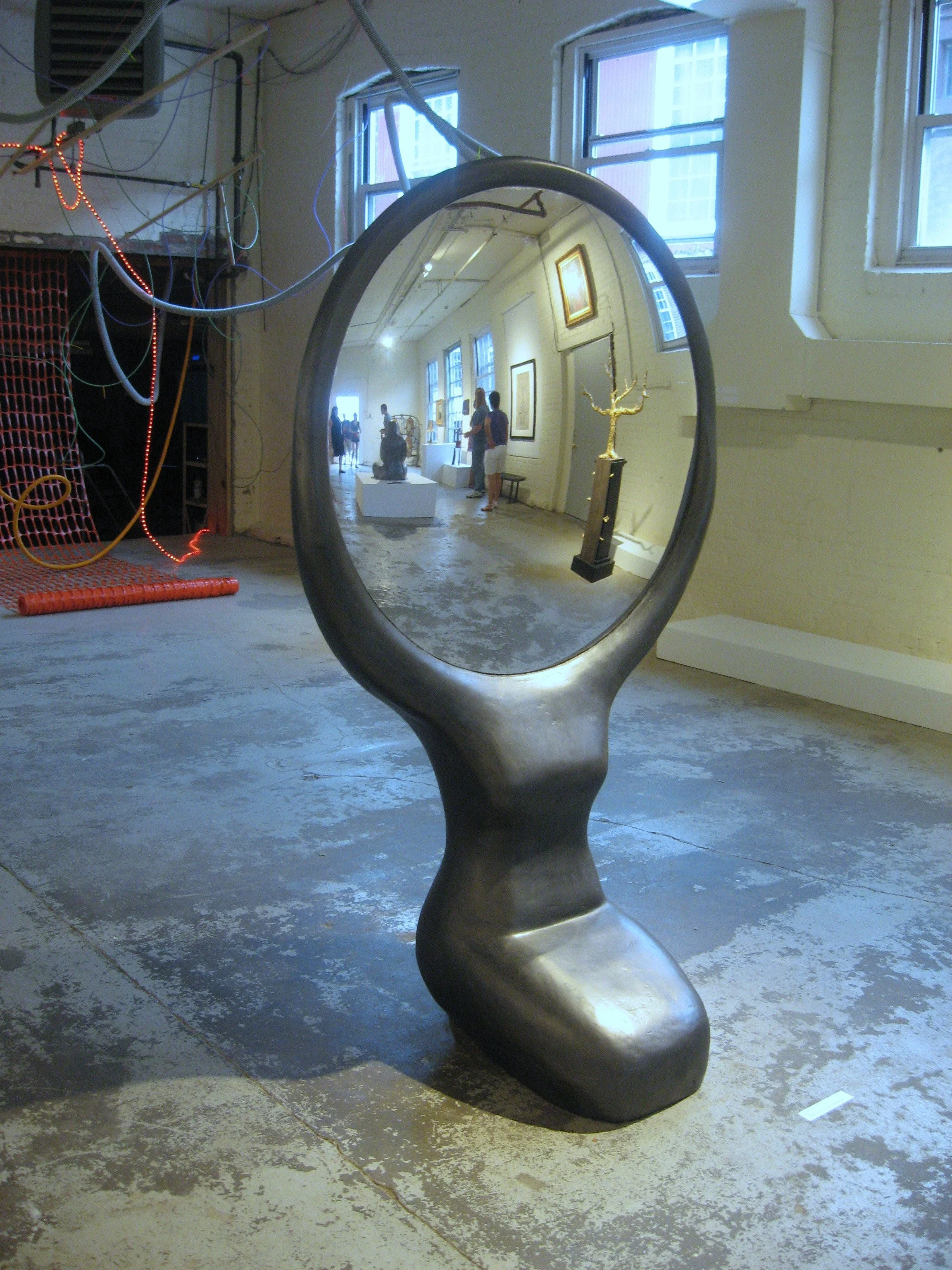 The theme of mirrors is explored in this series of abstract-figurative sculptures, made for both indoor and outdoor settings. These works incorporate round, oval, and convex mirrors—along with the viewer’s image. Beyond the magic of reflections are the physical properties of silvered glass and a wealth of meanings associated with water, vision, and other worlds.
